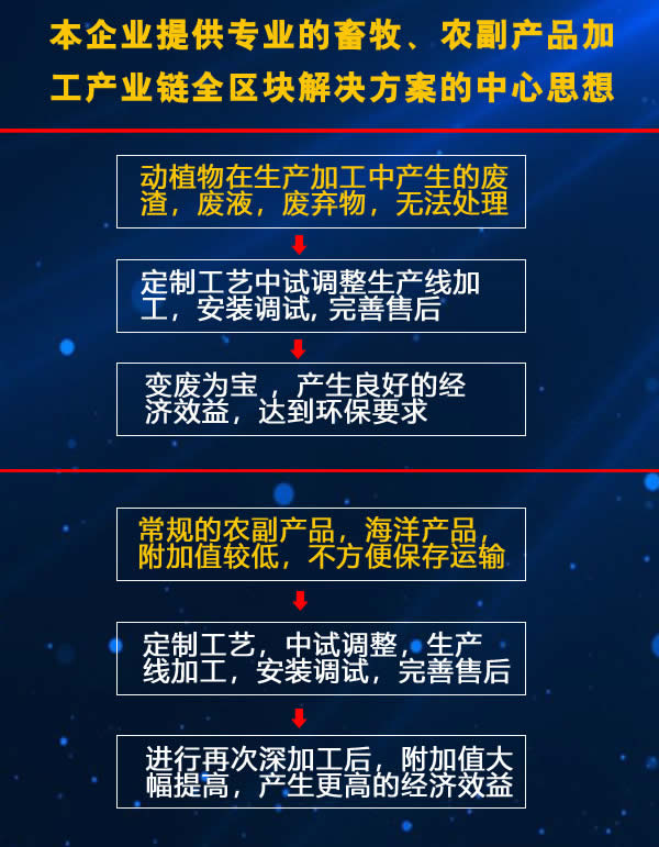 對含蛋白質的原料(符合食品原料要求)根據原料性質進行分別粉碎,絞碎,磨漿等處理,萃取脫油 → 對預處理料進行破壁,加溫,蒸煮等方法提取蛋白質,分離蛋白液,必要時需要濃縮處理 → 調整料液濃度,PH值,加入專用復合蛋白酶,攪拌酶解一定時間,調PH值,升溫滅酶 → 分離即進行分油,澄清,過濾清液 → 升溫,加除苦劑進行除苦,加脫腥劑進行脫腥 → 脫色,精制,分離后精濾 → 一級濃縮,二級濃縮,除菌過濾 → 無菌濃縮液進行蘇正干燥噴霧法干燥成低聚肽粉 → 冷卻后根據用戶要求進行分包。改善其性能,制造出目標產品。